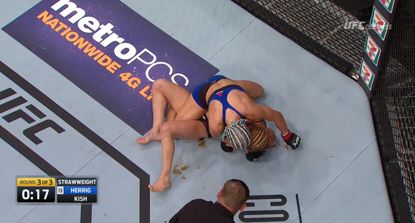 Felice Herrig sigraði Justine Kish á UFC bardagakvöldinu í Oklahoma á sunnudaginn. Í þriðju lotu sáust brúnir blettir á gólfi búrsins. Eftir smá átök hjá Kish varð smá slys með þessum afleiðingum.