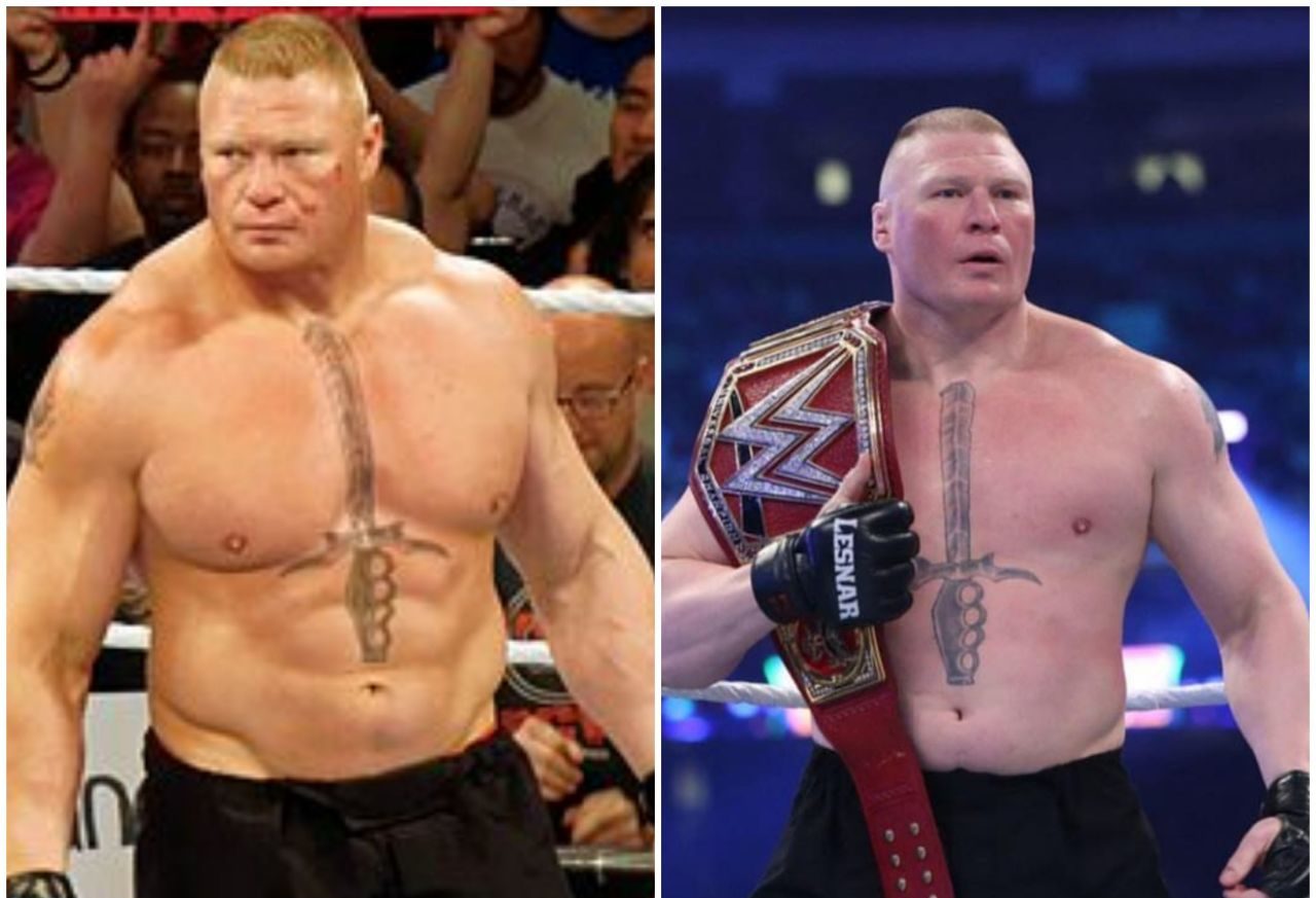 Lesnar var á sínum stað á WWE SummerSlam á sunnudaginn og þykjast einhverjir sjá mun á Lesnar eftir að hann var tekinn inn í lyfjaferli USADA. Hægra megin á neðangreindri mynd má sjá Lesnar eins og hann kom fyrir sjónir á sunnudaginn.