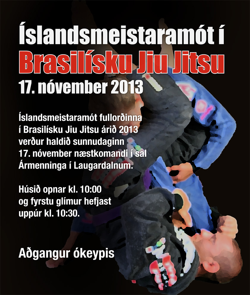 Íslandsmeistaramótið í BJJ fer fram nú á sunnudaginn í sal Ármenninga í laugardal. Húsið opnar kl 10 og munu fyrstu glímur byrja um 10:30. Keppt er í Gi (galla) og fer vigtun fram á mótsdag. Íslansdmeistaramótið í ár verður gríðarlega fjölmennt en 94 keppendur eru skráðir til leiks! Keppt er í átta þyngdarflokkum í karlaflokki og tveimur í kvennaflokki. Fimm Íslandsmeistarar frá því í fyrra keppa ekki með í ár en allir sigurvegarar opna flokksins undanfarin ár verða ekki með. Þetta mót er því að margra mati eitt mesta spennandi Íslandsmeistaramót frá upphafi.
