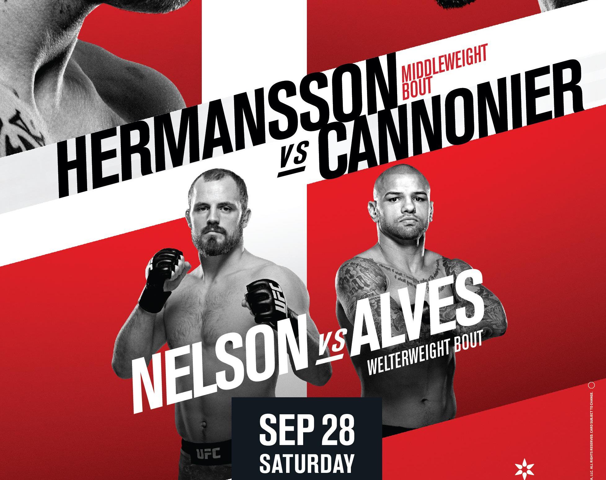 Plakatið fyrir bardagakvöldið var birt á Twitter fyrr í dag. Gunnar Nelson mætir Thiago Alves á bardagakvöldinu en í aðalbardaga kvöldsins mætast þeir Jack Hermansson og Jared Cannonier.