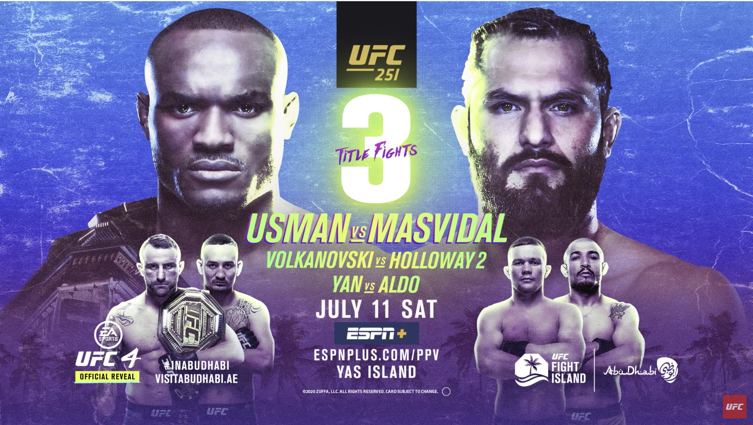 Þrír titilbardagar voru á dagskrá í nótt á UFC 251. Veltivigtarmeistarinn Kamaru Usman varði titilinn sinn þegar hann sigraði Jorge Masvidal í aðalbardaga kvöldsins. Masvidal byrjaði vel en Usman tók yfir bardagann þegar á leið. Usman stjórnaði Masvidal upp við búrið og náði að taka Masvidal niður nokkrum sinnum í bardaganum. Bardaginn fór að mestu fram upp við búrið þar sem Masvidal átti fá svör.