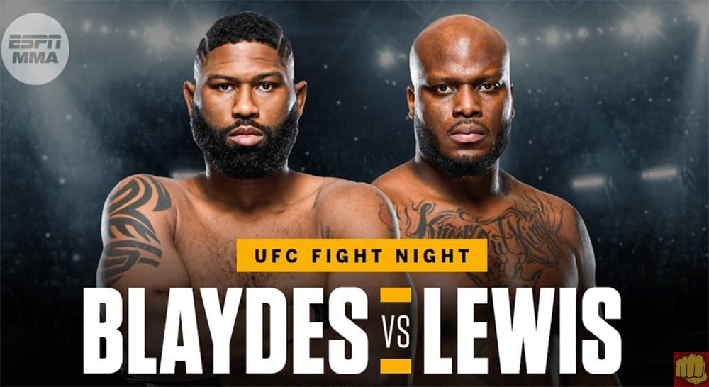 Curtis Blaydes fann snemma fyrir höggþunga Derrick Lewis í aðalbardaga kvöldsins. Blaydes náði þó góðum höggum sjálfur í 1. lotu. Blaydes reyndi fáar fellur en Lewis varðist þeim öllum. Í 2. lotu dýfði Blaydes hausnum niður til að fara í fellu og mætti upphöggi frá Lewis sem steinrotaði Blaydes.